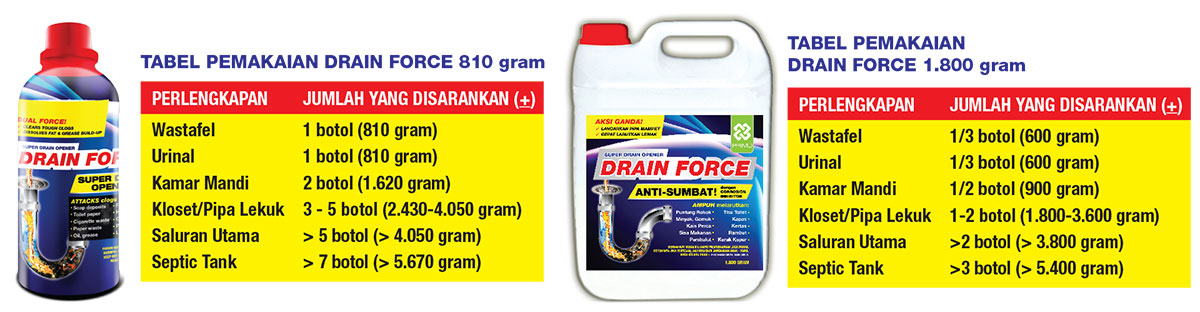 DRAIN FORCE adalah larutan konsentrat cair untuk melancarkan kembali saluran pembuangan tersumbat, akibat: rambut, kapas, kertas, kerak kapur, hampir semua material organik seperti: puntung rokok, tampon, gemuk, kertas toilet, kain perca, gumpalan rambut & kopi, dan beberapa material anorganik atau sisa makanan yang menyumbat saluran pembuangan bak cuci piring atau bak mandi & shower. Ampuh menetralisir alkaline yang disebabkan oleh sabun & detergen.